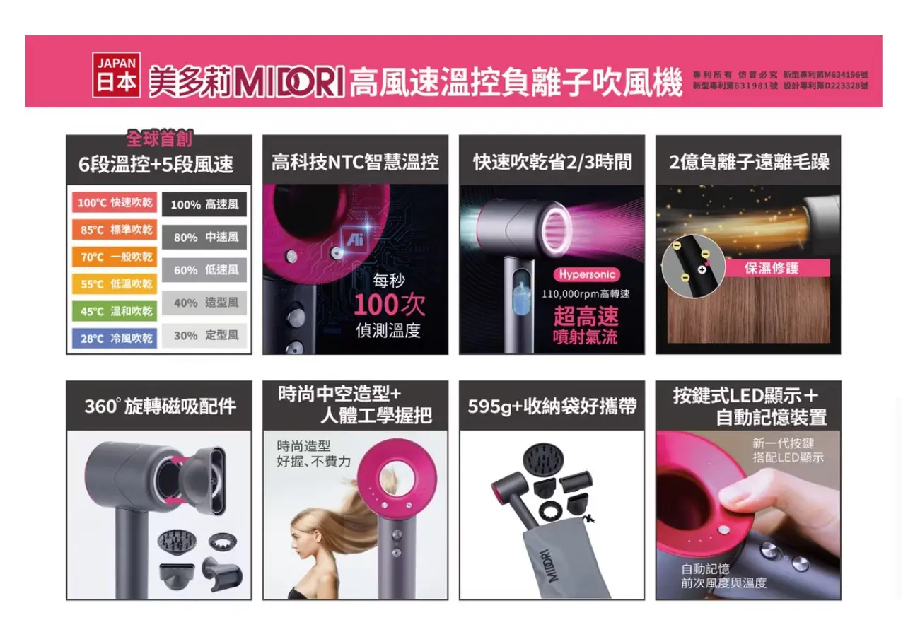 MIDORI 美多莉 Hypersonic 全球通 高速負離子吹風機(全配組) 國際全電壓適用/3色可選擇