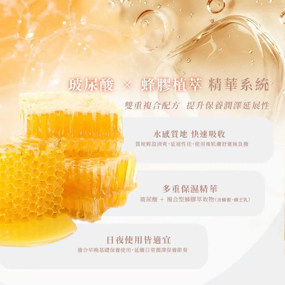 純水、戊二醇*、泛醇、甘油*、維生素B3、山梨糖醇、1,3-丙二醇*、異麥芽、丁二醇、麥芽糊精、三仙膠、尿囊素、積雪草萃取物、虎杖根萃取物、黃芩根萃取物、玻尿酸鈉*、檸檬酸、牛血小板、蜂蜜萃取、檸檬酸鈉、椰油基葡糖苷、旱芹萃取、蜂蜜、蜂王乳萃取、硬脂酸鎂、二氧化矽、卵磷脂、葡萄細胞萃取、迷迭香葉萃取物、茶葉萃取物、洋甘菊花萃取物、甘草根萃取物、蜂膠萃取、氰鈷胺(維生素B12)