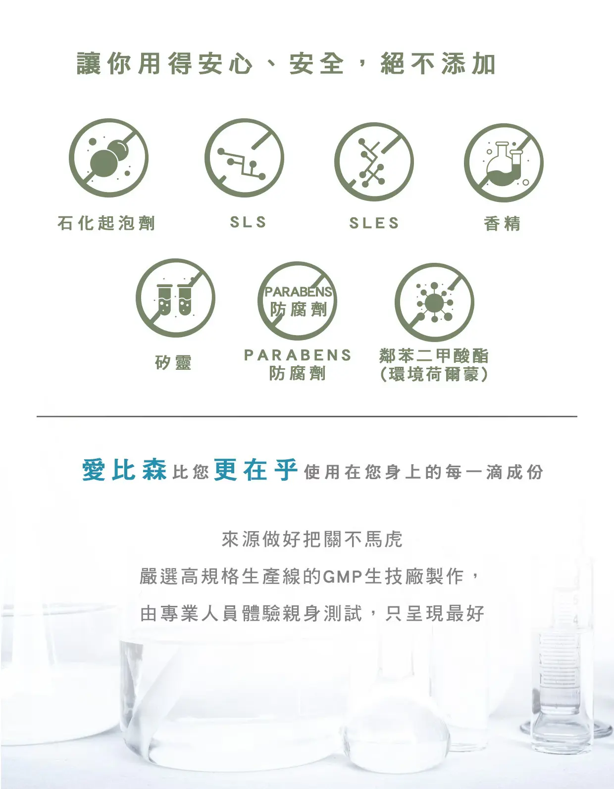 純水、2-磺基月桂酸甲酯鈉、2-磺基月桂酸二鈉、椰油醯胺丙基甜菜鹼*、癸基葡萄糖苷*、椰油醯谷氨酸二鈉*、1,3-丙二醇*、玫瑰純露、葡萄糖酸內酯*、水解荷荷芭酯*、PEG-120 甲基葡萄糖二油酸酯、玫瑰草精油、海藻醣、山茶花萃取、氯苯甘醚、谷氨酸二乙酸四鈉*、天竺葵精油、水解小麥蛋白*、苯甲酸鈉、葡糖酸鈣、聚季銨鹽-67、醒目薰衣草精油、檸檬精油、檸檬酸、安息香精油