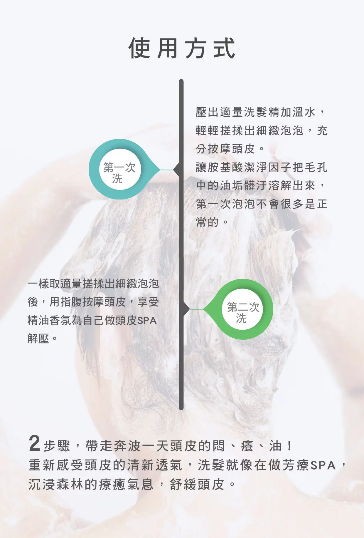 ◎使用方法:取適量在濕的手上起泡後,均勻塗抹於濕的頭皮上,用指腹按摩頭皮,附帶清潔髮絲(按摩3~5分鐘,停留數分鐘使其分解油垢),用水洗淨。(請依頭皮狀況,重複洗頭流程2~3次。