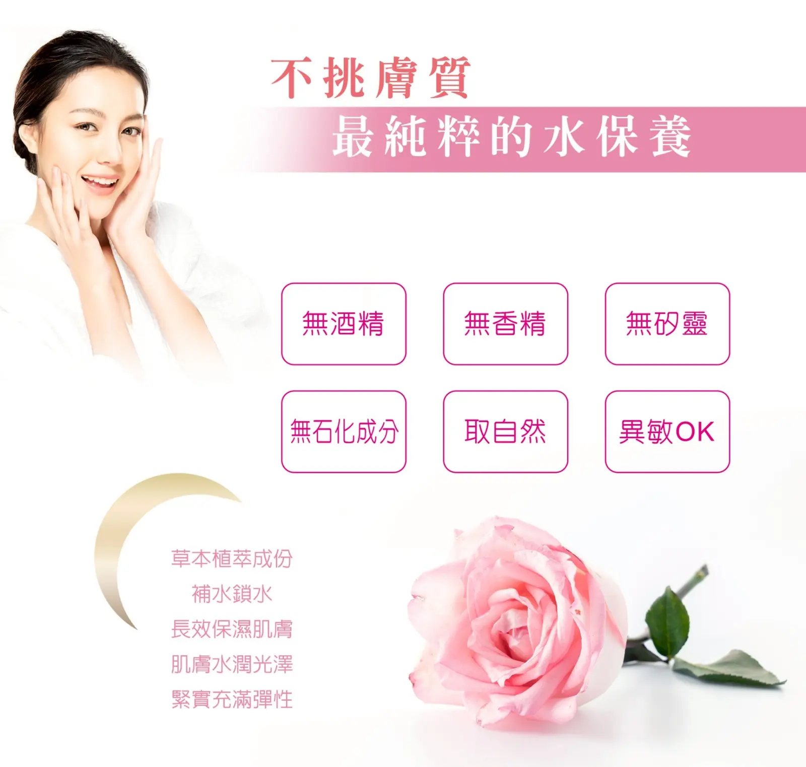 有機認證成分選用:有機玫瑰純露、有機水解羽扇豆蛋白