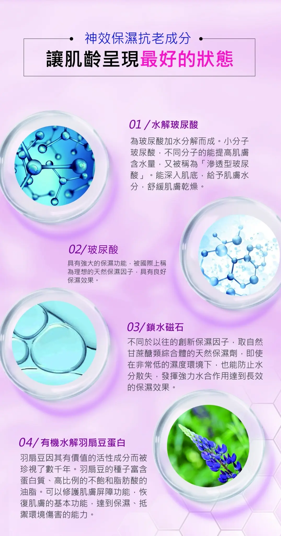天然認證成分選用:鎖水磁石(異構寡糖)、玻尿酸、水解玻尿酸、玉米多元醇