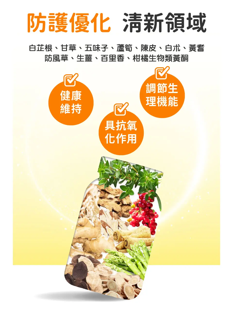 ◆主要成分:微結晶纖維素、白芷根提取物、甘草提取物、五味子提取物、蘆筍提取物、陳皮萃取物、白朮萃取物、黃耆提取物、防風草提取物、生薑萃取物、百里香萃取物、柑橘生物類黃酮、 聚乙烯☆咯烷酮、羧甲基纖維素鈉、羥丙基甲基纖維素、硬脂酸鎂、滑石粉、食用黃色四號鋁麗基、二氧化 鈦、聚乙二醇6000、胭脂紅
