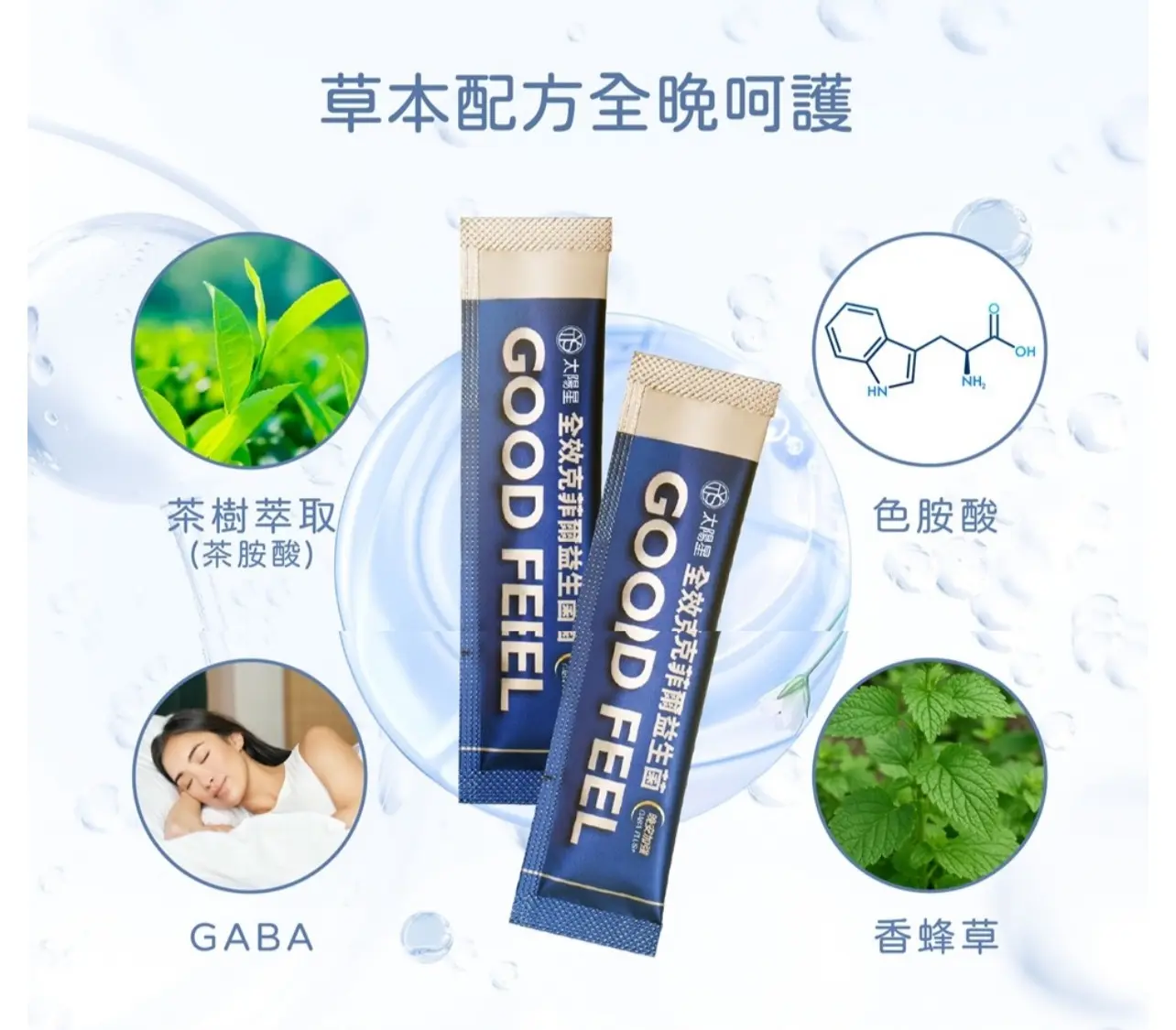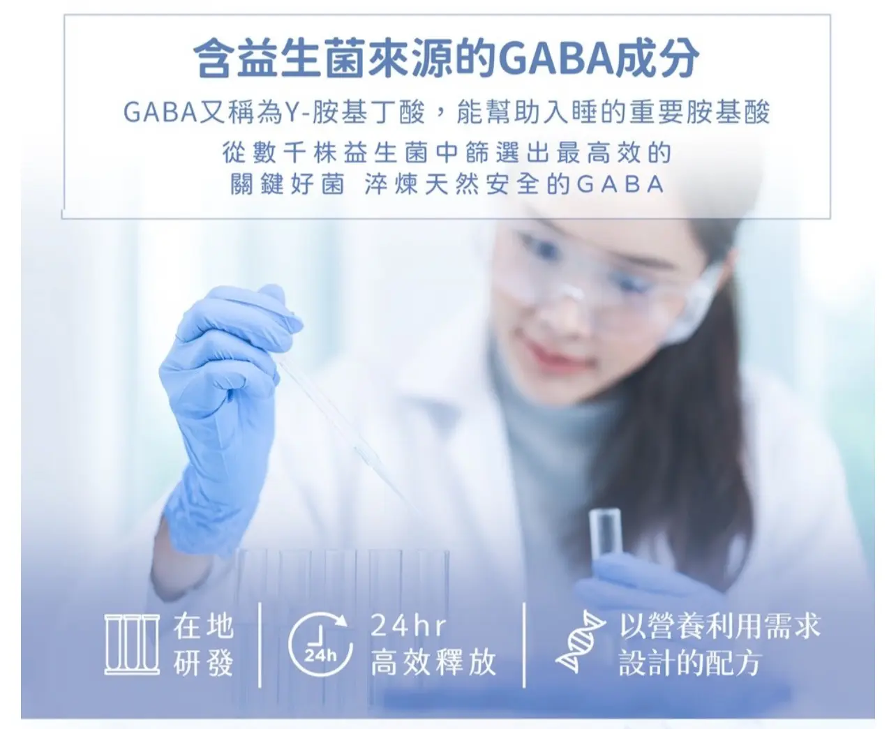 A7:主要成分包括:GABA、專利 M1 克菲爾菌株、七大乳酸菌(含嗜酸乳桿菌、長雙歧桿菌等)、色胺酸、香蜂草、茶胺酸。