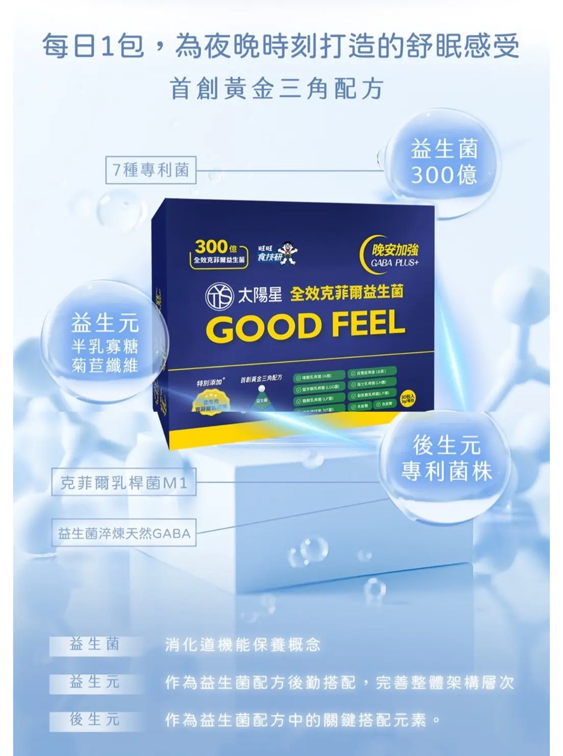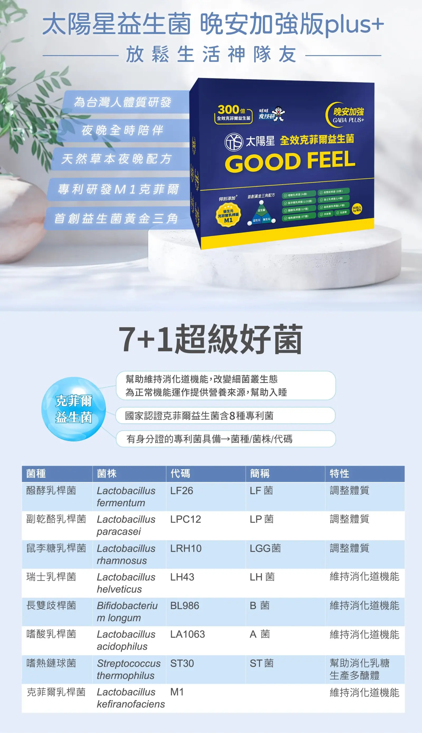 太陽星晚安加強版克菲爾益生菌特別設計為夜間使用,延續原有黃金三角配方(益生菌、益生元、後生元),每包含300億多元活菌,涵蓋8種乳酸菌與專利M1菌株,結合羽衣甘藍與藍莓等植物來源營養,讓日常保養更輕鬆。