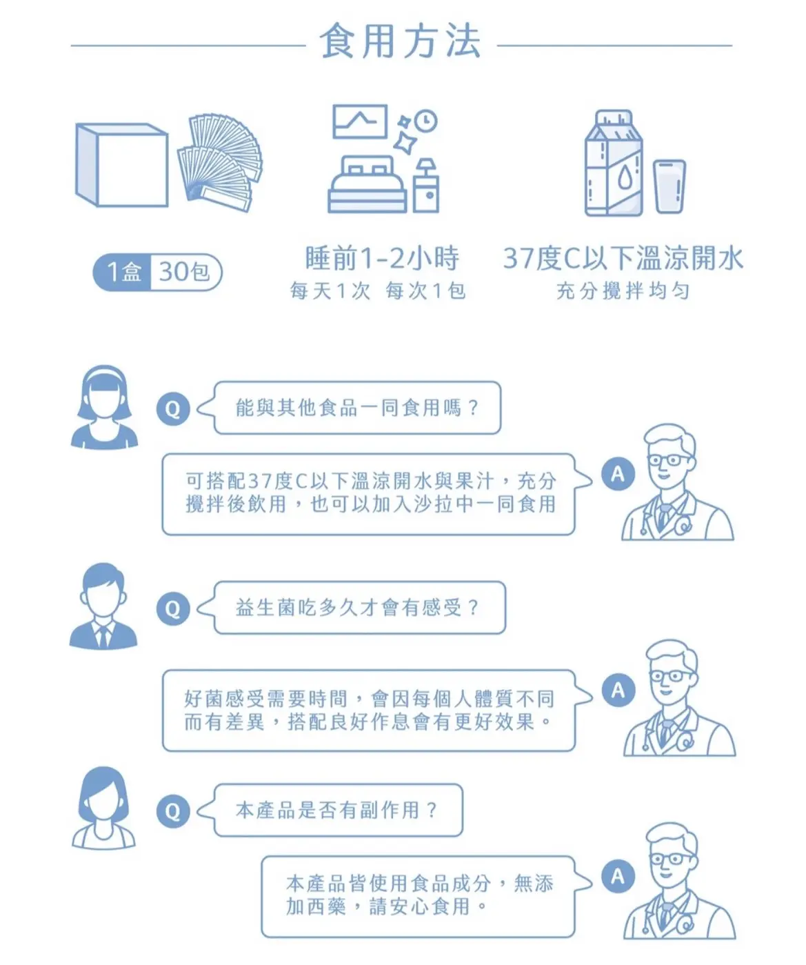 A3:建議每天 1 包,搭配37度以下溫水或常溫水睡前半小時食用,並配合白天起床後多喝水,幫助益生菌發揮最佳作用。