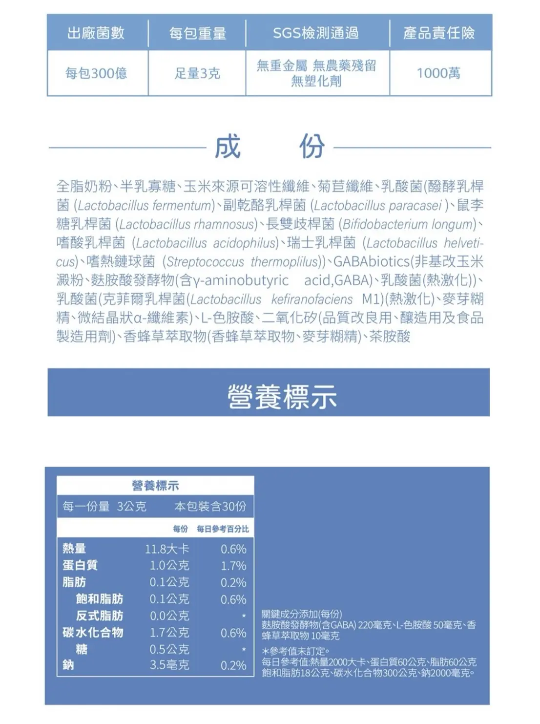 、瑞士乳桿菌、嗜熱鏈球菌、麩胺酸發酵粉(GABAbiotics)、乳酸菌(熱激化(Lactobacillus kefiranofaciens M1)、非基改玉米澱粉